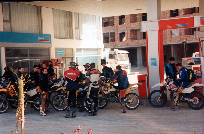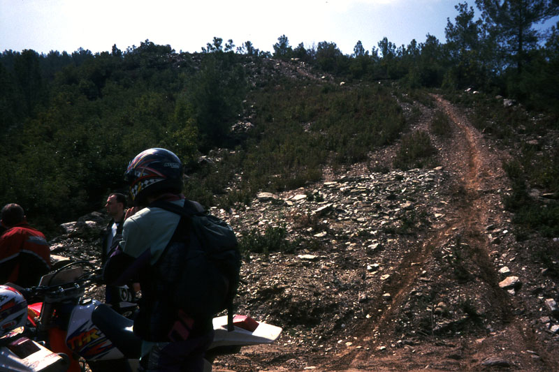 "Wer ist der beste Fahrer von euch?" lautete die Frage, ein dezenter Hinweis auf die Hoope-Erfolge brachte Flori die WR360 ein. Diese wollte jedoch nicht anspringen, einige Zeit später überschlug sich diese beim Anschieben dank nicht trennender Kupplung, glücklicherweise ist dem Mech dabei nichts groß passiert. Manfred erhielt eine 540SXC mit recht abgefahrenem Hinterreifen, ich ergatterte mangels Alternativen eine 97er 620SC ohne Ausgleichswelle, die sich in recht brauchbarem Zustand zeigte. Yves erhielt eine TT-R 600 und Martin eine TT-R 250, dank E-Starter, niedrigem Schwerpunkt und sanftem Fahrverhalten sicher ein super Enduro-Einstiegsfahrzeug. Nun, die WR war vorerst ausser Gefecht, also durfte Flori die Ehre von Kawa auf einer alten KLR250 "Das Geschwür" aufrecht erhalten. Er machte aus der Not eine Tugend und zeigte, daß trotz ständig durchschlagender Federelemente auch mit diesem Teil einiges geht.