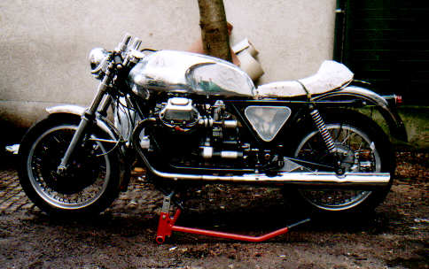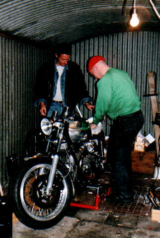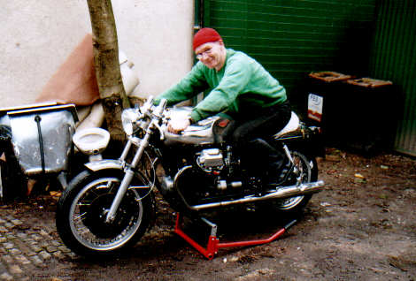 Links aussen: eine Badewanne. Daneben: eine Kloschüssel. Wiederum daneben: ich auf der Guzzi. Nur damit es nicht zu Verwechslungen kommt. Man beachte die entspannte Sitzposition. Vielleicht beträgt der Radstand DOCH zwofuffzig. Demnächst mal nachmessen. (Anmerkung von Kathinka: Und vielleicht solltest du die Stummel _über_ der Gabelbrücke befestigen...) |