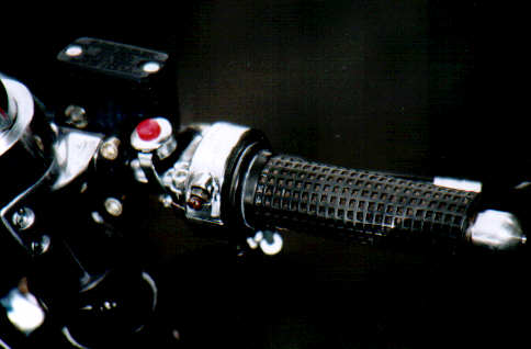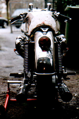 Landschaftsaufnahme: Lenker rechts. Nach Entfernung der grauslich braun-roten Zündkerzenstecker (s.o.) wird der leuchtende Anlasserknopf das einzig Farbige an diesem Krad sein. Auch ich werd' mich freilich, wenn ich es je fahren sollte, aus meinem grünen Sweatshirt winden und ich werde das alberne rote Hütchen, das die Glatze kaschiert, absetzen, und stilvoll in schwarzes Leder gekleidet und schwarz jetbehelmt und climaxbebrillt..usw..usf..es fehlt noch die gesamte Elektrik und die Instrumentierung. Bis zur MF 2Yk+1 wird das wohl nix mehr mit dem stilvollen Auftritt. |