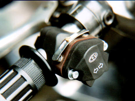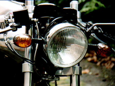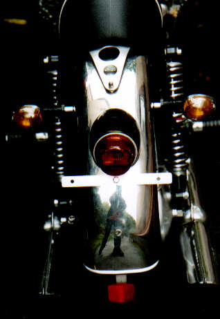 HA! Sie sehen, daß Sie nichts sehen! Keinen Lampenhalter nämlich. Original selbstgemachte abgeguckte "englische" Lösung: Drahtgestell zwischen der Unterseite der oberen und der Oberseite der unteren Gabelbrücke. |